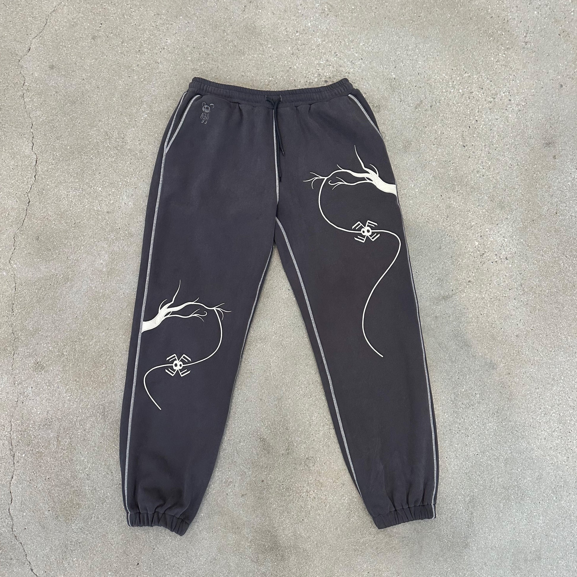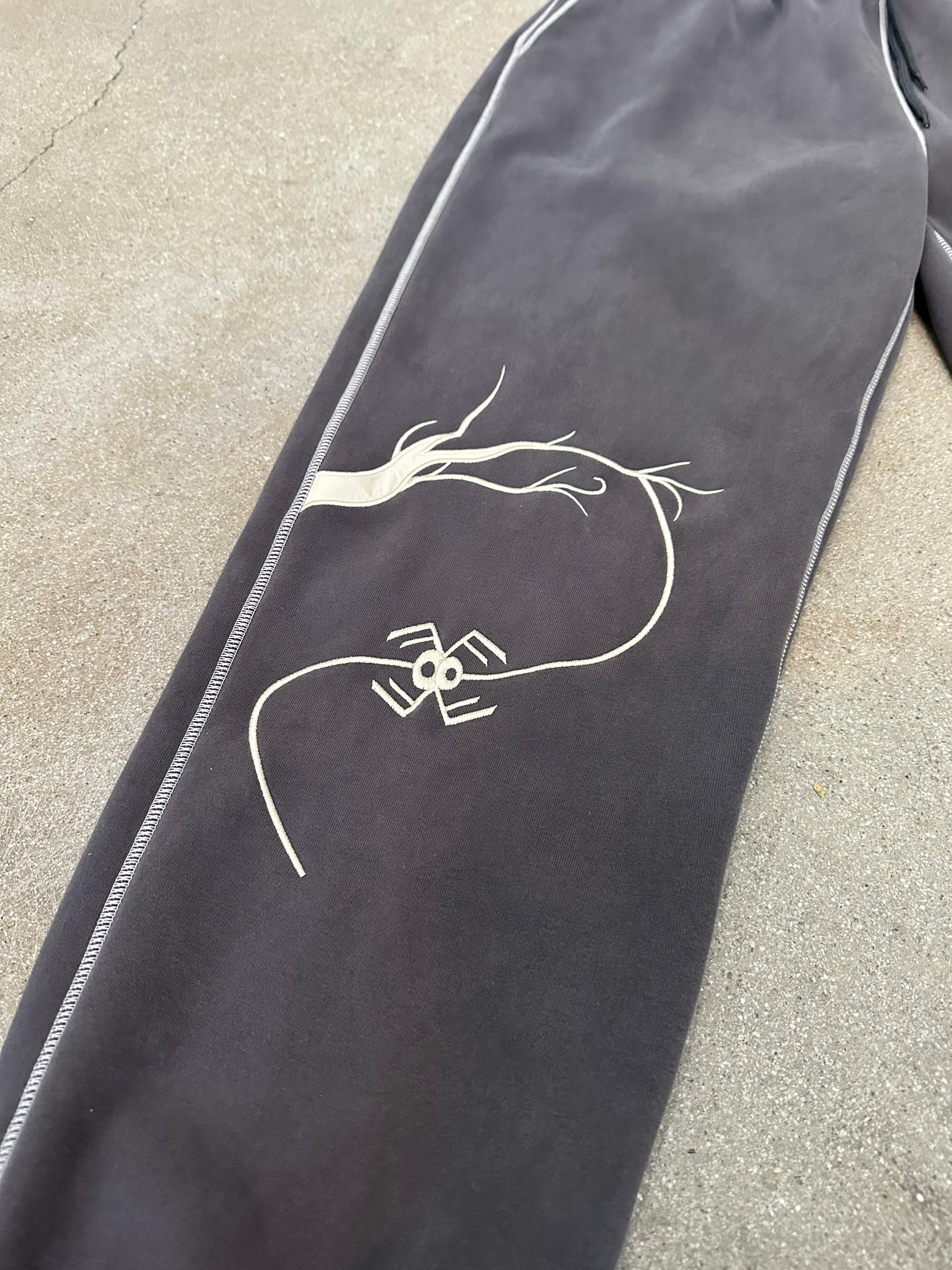 Cotton fleece, 400 gsm sweatpants with embroidery details, and loose baggy fit.
